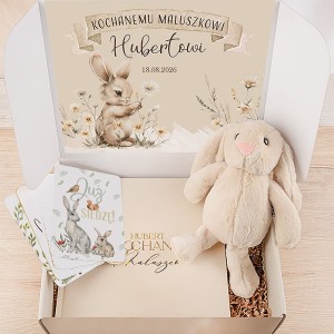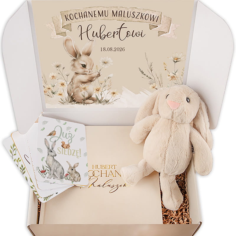 Zestaw prezentowy dla noworodka to pięknie zaprojektowana propozycja, która łączy w sobie estetykę, delikatność i praktyczne zastosowanie. Idealnie sprawdzi się jako wyjątkowy upominek z okazji narodzin dziecka, baby shower, chrztu czy pierwszych odwiedzin maluszka. Całość została starannie zapakowana w ozdobne pudełko z pastelową grafiką króliczka i napisem „Z najlepszymi życzeniami”. Wewnątrz zestawu znajduje się miękki pluszowy króliczek – przytulanka z długimi uszami, która idealnie nadaje się do tulenia już od pierwszych dni życia. Maskotka szybko stanie się nieodłącznym towarzyszem snu i zabawy dziecka, dając poczucie bezpieczeństwa i komfortu. Kolejnym elementem jest elegancki album na zdjęcia wklejane z welurową okładką ozdobiony złoconym napisem. Na jego okładce znajduje się także personalizacja – imię dziecka – co czyni go unikalną, bardzo osobistą pamiątką. Album przeznaczony jest do przechowywania najważniejszych zdjęć z pierwszych miesięcy i lat życia dziecka.
