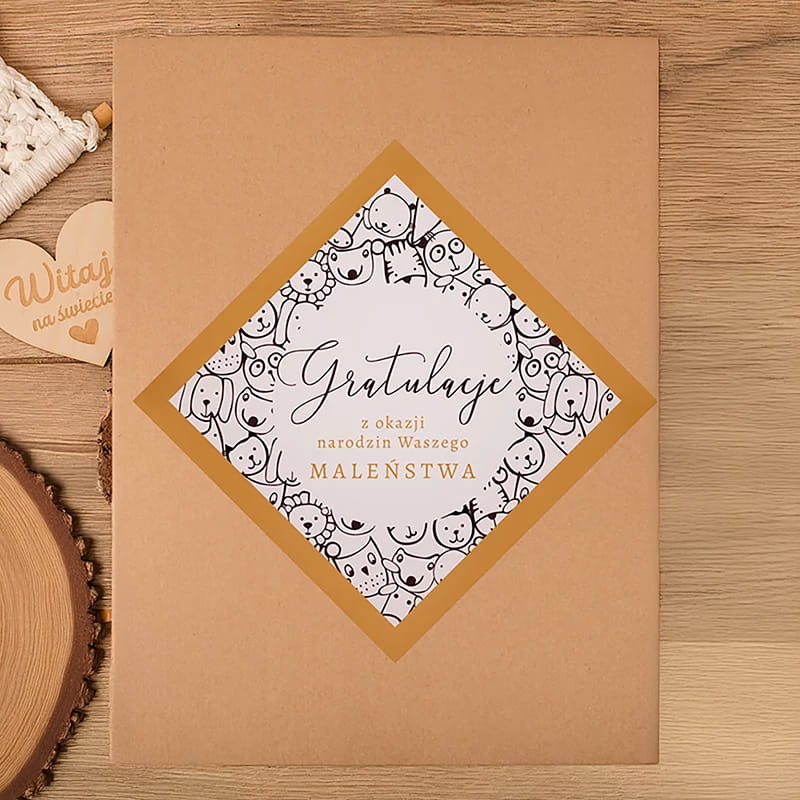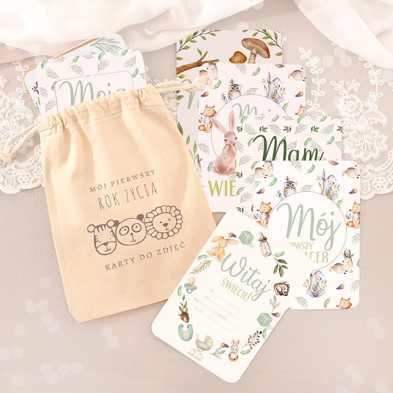 Uzupełnieniem kompletu są karty do zdjęć dokumentujące pierwsze 12 miesięcy życia dziecka. Dzięki nim rodzice w prosty sposób uwiecznią najważniejsze etapy rozwoju, takie jak pierwszy uśmiech, ząbek czy krok. Symbolicznym dodatkiem jest także drewniane serduszko z grawerem „Witaj na świecie”, które może stać się drobną pamiątką przechowywaną na lata.