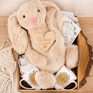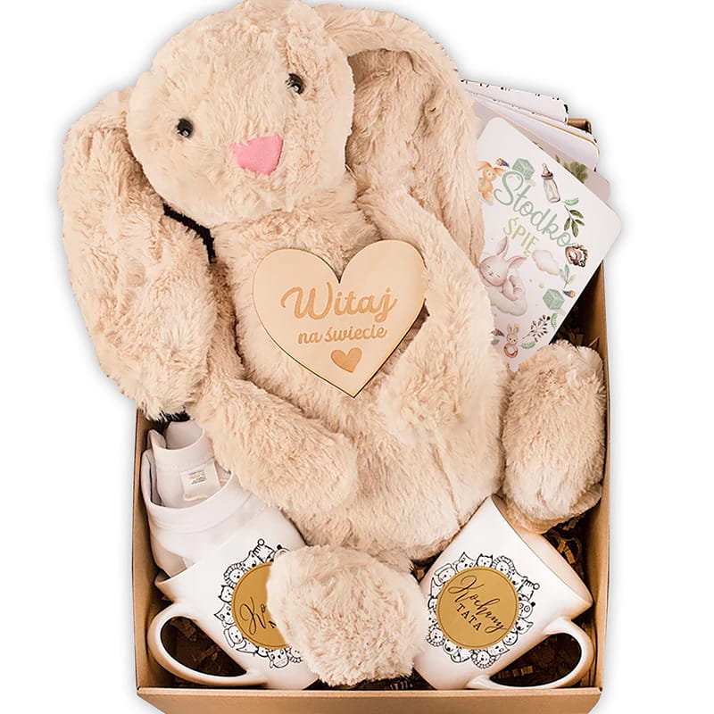 Zestaw prezentowy dla rodziców i noworodka zawiera pluszowego króliczka, body dla maluszka, kubki dla mamy i taty, karty do zdjęć oraz drewniane serduszko w pudełku z gratulacyjną etykietą.