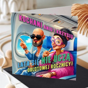 Na okładce kartki znajduje się kolorowa ilustracja przedstawiająca zakochaną parę w samolocie. Tekst „Lata się nie liczą – odlotowej rocznicy!” idealnie koresponduje z motywem podróży i nawiązuje do wspólnego przeżywania lat w związku. Wewnątrz kartki znajdują się rymowane życzenia, które łączą lekkość, humor i pozytywne przesłanie.