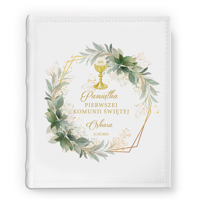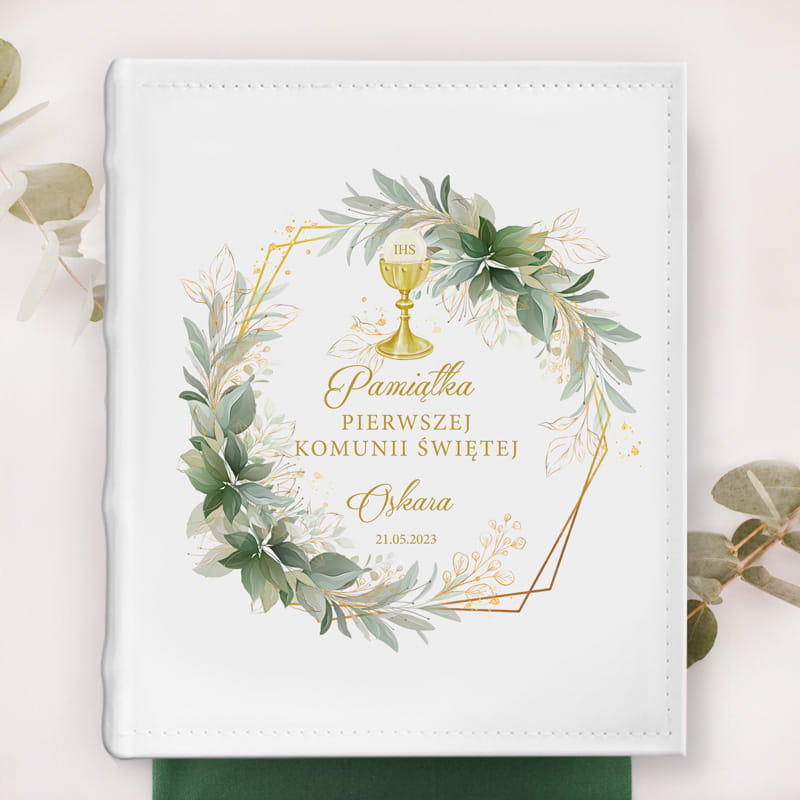 Album komunijny łączy klasyczną elegancję z subtelnym, naturalnym wzornictwem. Okładka wykonana jest z wysokiej jakości materiału w odcieniu jasnej bieli, co nadaje jej szlachetny wygląd. Centralnym elementem jest wieniec z zielonych liści i złotych zdobień, który otacza złoty kielich z symbolem IHS – nawiązujący do duchowego znaczenia uroczystości. Całość podkreśla elegancki napis „Pamiątka Pierwszej Komunii Świętej” oraz personalizowane imię dziecka. Na dole znajduje się data komunii, co sprawia, że album nabiera jeszcze bardziej osobistego charakteru. Każda strona została wykonana z grubego, trwałego papieru, który doskonale nadaje się do wklejania zdjęć. Przestronne karty pozwalają na dowolne rozmieszczenie fotografii oraz dodanie odręcznych notatek czy wpisów od najbliższych. Solidne szycie i mocna oprawa zapewniają trwałość, dzięki czemu album z imieniem dziecka pozostanie w idealnym stanie przez długie lata.