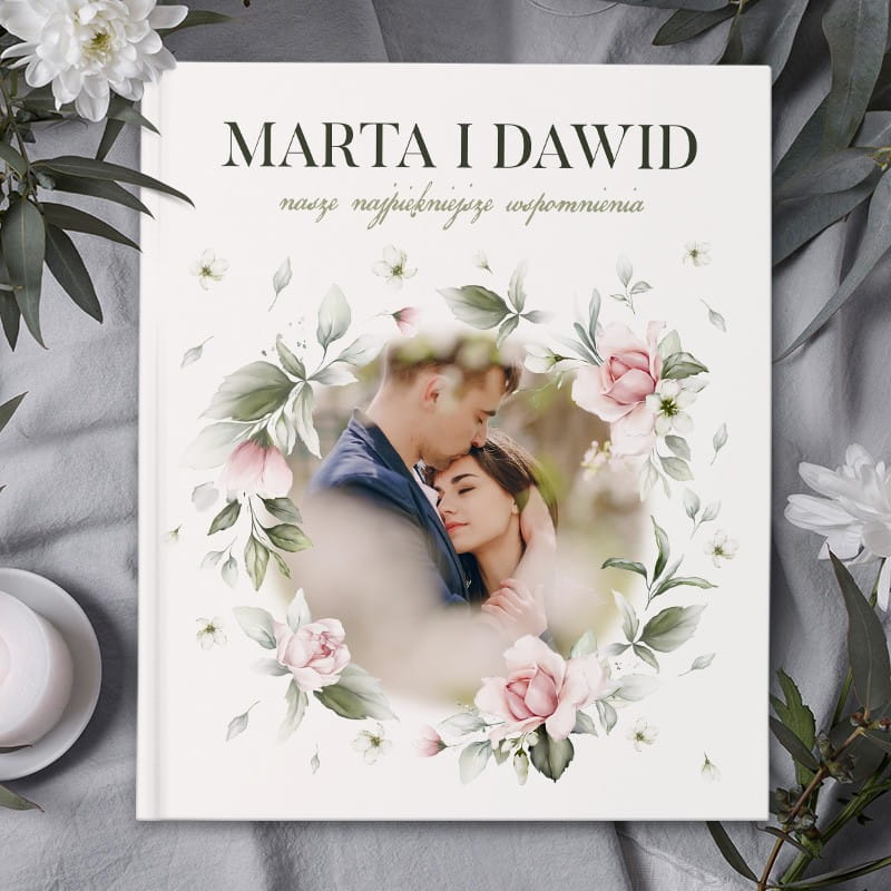 Okładka albumu została wykonana z materiału w jasnym, neutralnym odcieniu. Na jej froncie znajduje się miejsce na zdjęcie oraz imiona pary i subtelny napis “nasze najpiękniejsze wspomnienia”. Dookoła widnieje delikatna ramka z kwiatowymi motywami w pastelowych kolorach. Środek albumu zawiera karty z miejscem na wklejenie zdjęć oraz zapiski – idealne do opisu dat, wydarzeń lub wspomnień.