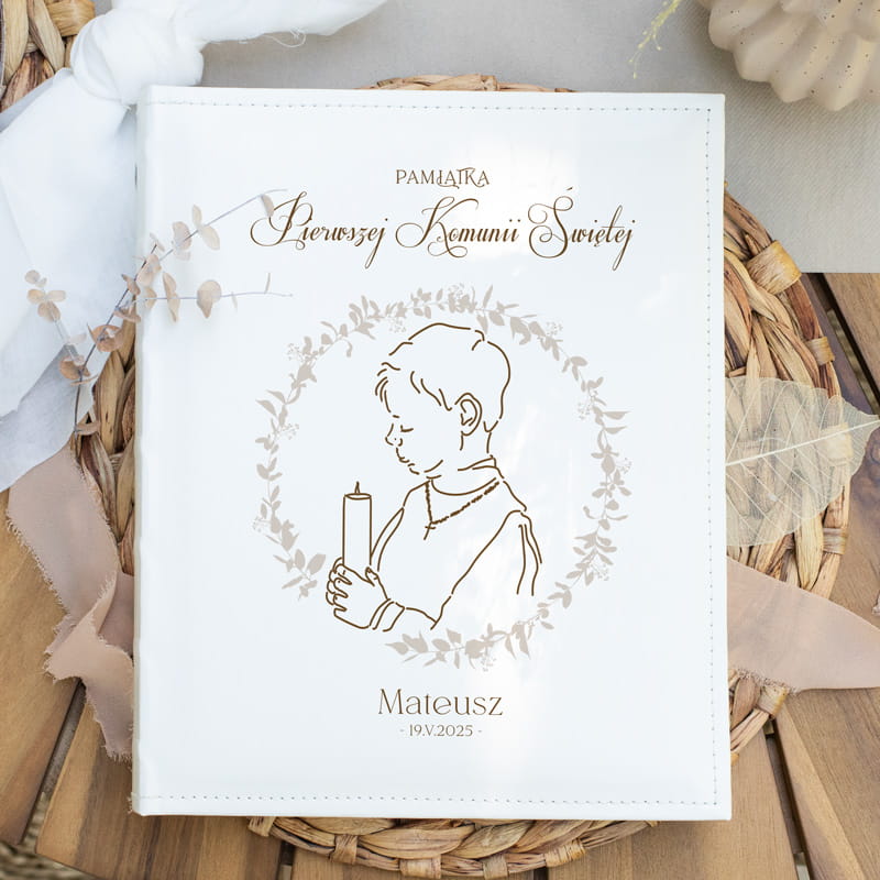 Album komunijny to połączenie klasyki i delikatnych, religijnych motywów. Twarda, błyszcząca okładka w jasnym odcieniu prezentuje minimalistyczną grafikę chłopca w odświętnym stroju, trzymającego w dłoniach zapaloną świecę. Wokół postaci znajduje się elegancki wieniec z subtelnych gałązek, tworzący harmonijną kompozycję. Na górze okładki widnieje napis „Pamiątka Pierwszej Komunii Świętej”, zapisany ozdobnym stylem pisma. Poniżej znajduje się personalizacja – imię dziecka oraz data uroczystości, co nadaje albumowi indywidualnego charakteru i sprawia, że nabiera on emocjonalnej wartości. Wnętrze albumu skrywa grube, wysokiej jakości strony przeznaczone do wklejania zdjęć. Każda karta pozostawia przestrzeń na własne wpisy, dedykacje lub pamiątkowe cytaty. Dzięki solidnej oprawie i starannemu wykonaniu album z imieniem dziecka przetrwa długie lata, pozwalając wracać do tych pięknych wspomnień.
