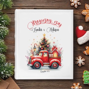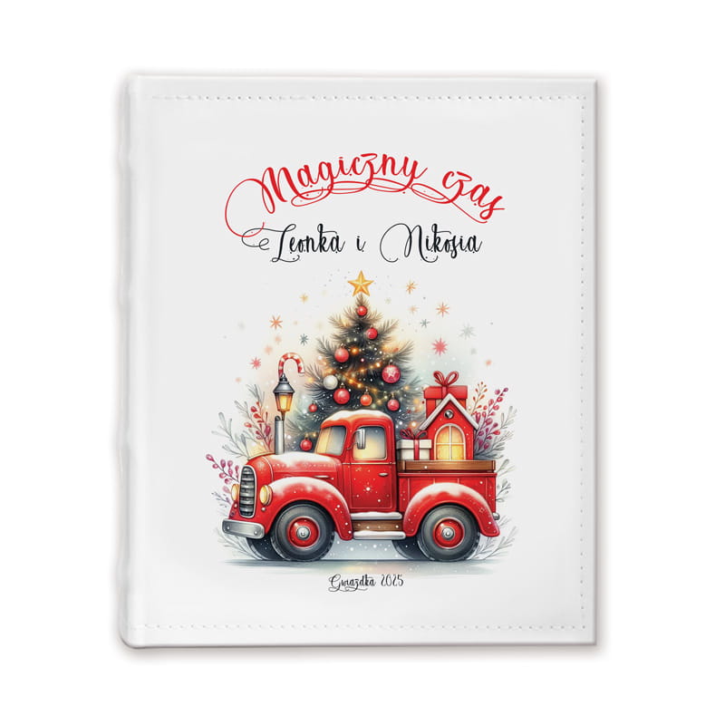 Personalizowany świąteczny album na zdjęcia wklejane dla dziecka to produkt stworzony z myślą o zachowaniu magii wspólnie spędzanych chwil. Jego bożonarodzeniowy charakter od razu przyciąga uwagę – od eleganckiego tytułu "Magiczny czas", przez ciepłą grafikę czerwonego auta z choinką, aż po możliwość dodania imion dzieci, co czyni go niepowtarzalnym. Personalizowany album to sposób, by zachować wspomnienia z pierwszej gwiazdki, ubierania choinki, czy wspólnego pieczenia pierników w formie tradycyjnego, wklejanego albumu. Dzięki temu każde zdjęcie staje się częścią rodzinnej historii.