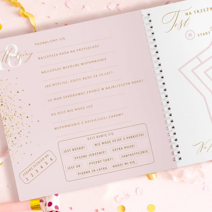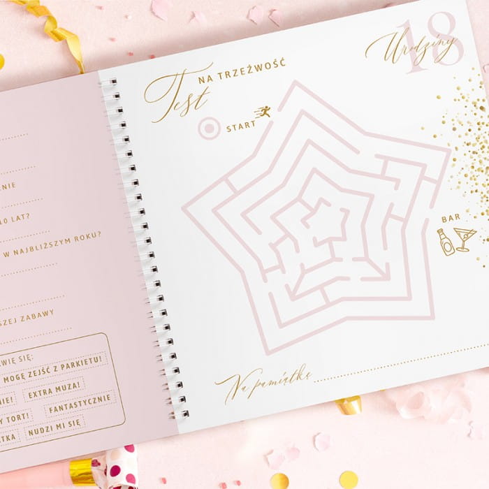 Księga na 18. urodziny wyróżnia się elegancką, pastelowo-różową okładką z akcentami złota i możliwością personalizacji, co nadaje jej unikatowy charakter. Oprócz przestrzeni na życzenia i wspomnienia księga zawiera specjalnie zaprojektowany "Test Trzeźwości" - zabawny labirynt, który goście mogą próbować przejść. Ten kreatywny dodatek nie tylko rozśmiesza uczestników, ale również sprawia, że każdy może zostawić po sobie ślad w formie niekonwencjonalnego wpisu. Możliwość personalizacji poprzez dodanie imienia solenizanta sprawia, że księga staje się jeszcze bardziej osobista. Każda strona jest starannie zaprojektowana, aby zapewnić przestrzeń na indywidualne przesłania i artystyczne dodatki od przybyłych gości.