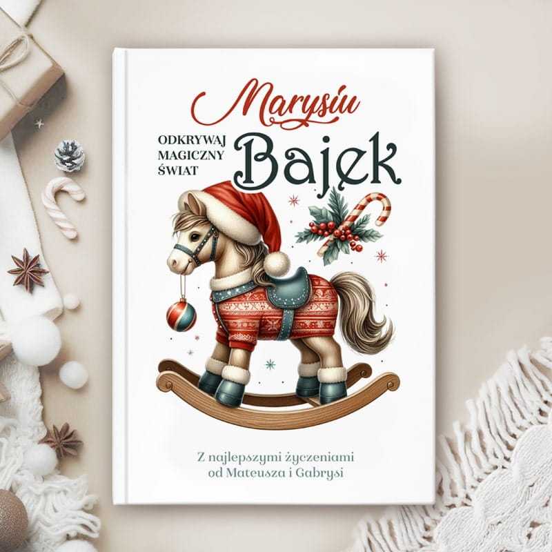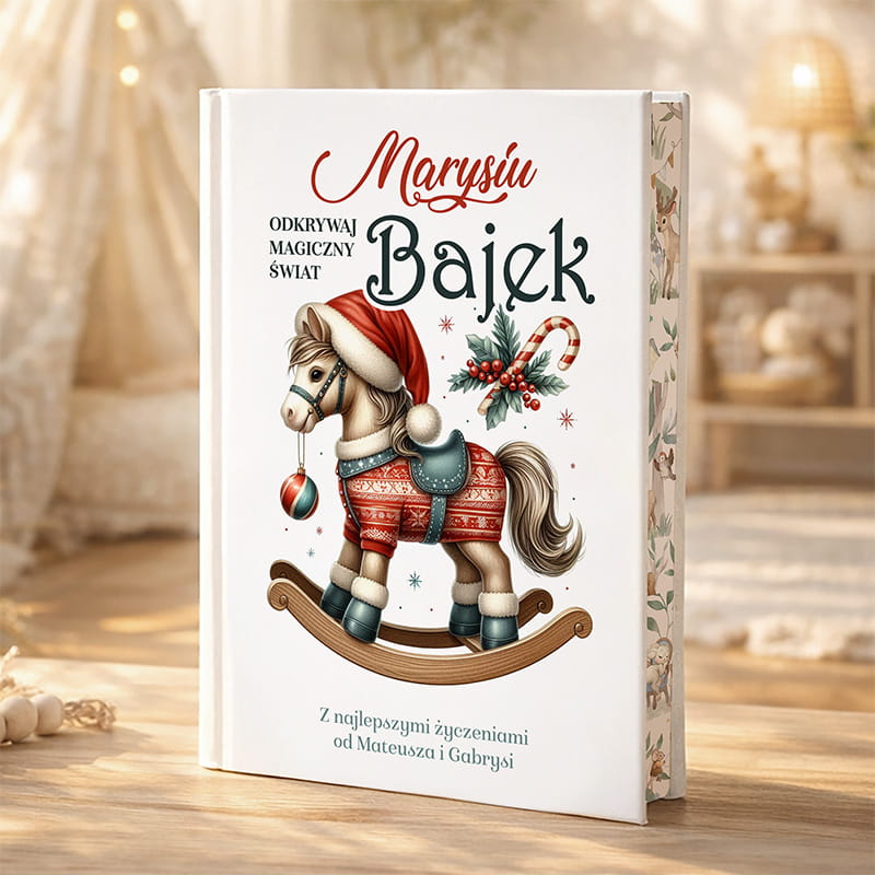 Oprawa książki wykonana jest w twardej formie. Na froncie znajduje się ilustracja świątecznego konika na biegunach ubranego w czerwony sweterek z norweskim wzorem oraz czapkę Mikołaja. Otoczony gałązkami z ostrokrzewem, laską cukrową i śnieżynkami, tworzy ciepły, zimowy nastrój. Na górze widnieje napis z imieniem dziecka oraz zwrot „Odkrywaj magiczny świat bajek”, a na dole – indywidualna dedykacja od osoby wręczającej prezent. Całość utrzymana jest w spójnej, pastelowej kolorystyce, która przyciąga uwagę i podkreśla świąteczny charakter produktu.