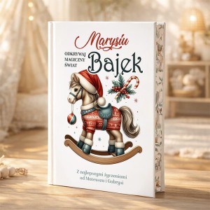 Bajeczki do poduszeczki dla dziecka ze świątecznym motywem to personalizowana książeczka pełna ciepła, ilustracji i opowieści idealnych na zimowe wieczory. Twarda oprawa z uroczą grafiką konika na biegunach, ozdobiona imieniem dziecka i dedykacją, czyni z niej nie tylko wartościową lekturę, ale również wyjątkowy prezent na święta.