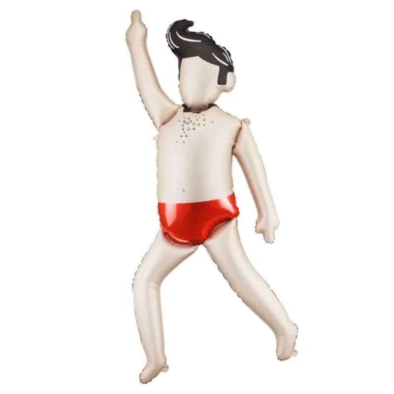 Balon przedstawia stylizowaną postać mężczyzny w dynamicznej pozie z uniesioną ręką. Postać ma jasną sylwetkę, ciemne włosy oraz charakterystyczne czerwone slipy, które kontrastują z resztą balonu. Na klatce piersiowej widoczne są drobne detale imitujące owłosienie, co dodaje całości humorystycznego charakteru. Całość wykonana jest z błyszczącej folii, a nieregularny kształt balonu odwzorowuje sylwetkę postaci, dzięki czemu świetnie prezentuje się na zdjęciach.