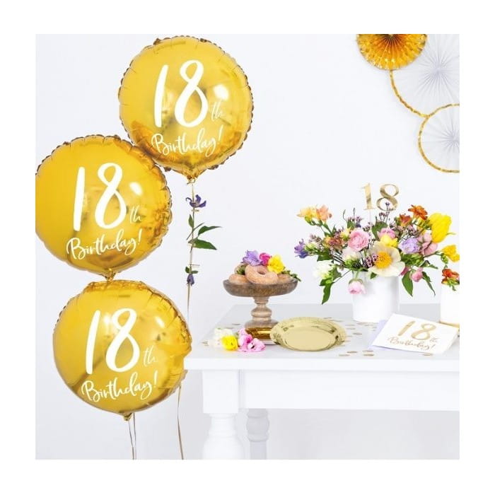 - Ten balon wyróżnia się z dwóch powodów. Jednym z nich jest jego rozmiar, a właściwie średnica sięgająca niespełna 0,5 metra! Drugą cechą, która rzuca się w oczy, jest oczywiście kolor. Całość pokrywa błyszcząca powłoka w przyjemnym odcieniu złota. Na froncie znajduje się biały napis „18th Birthday”. Balon powstał z folii, co nadaje mu większą trwałość i sprawia, że ma ciekawszą postać od tych w wersji tradycyjnej. Może zostać napełniony powietrzem lub helem, dla jeszcze lepszego efektu.