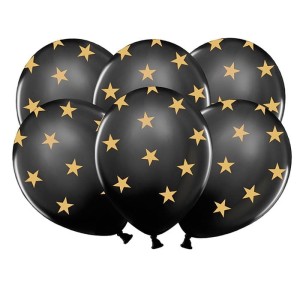 - zestaw sześciu balonów w czarnym kolorze, obsypanych złotymi gwiazdami