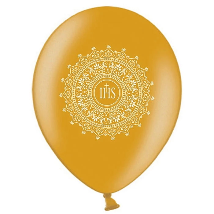 Zestaw zawiera 6 balonów w eleganckim, złotym kolorze z dekoracyjnym nadrukiem inspirowanym koronką oraz symbolem IHS. Subtelny wzór nadaje całości wyjątkowego wyglądu, dzięki czemu balony świetnie prezentują się zarówno pojedynczo, jak i w większych kompozycjach.