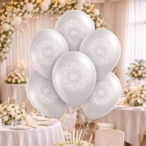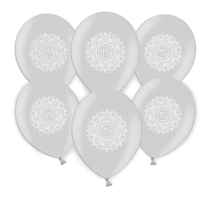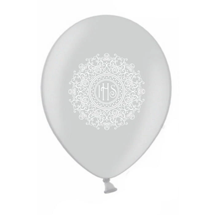 Zestaw zawiera 6 balonów w modnym, srebrnym kolorze z subtelnym nadrukiem inspirowanym koronką oraz symbolem IHS. Jasna kolorystyka i dekoracyjny wzór sprawiają, że balony prezentują się lekko i elegancko, doskonale wpisując się w charakter uroczystości komunijnej.