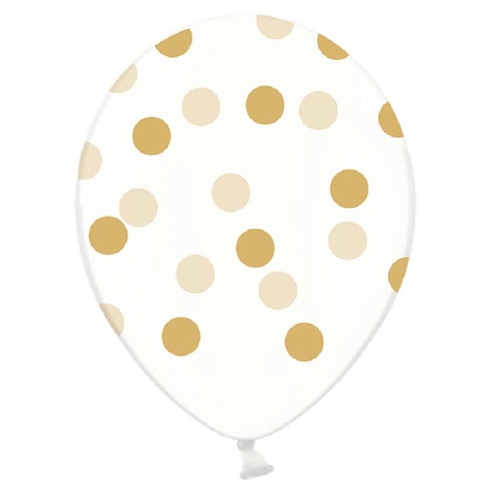 Balony wykonane są z przeźroczystego materiału z nadrukowanym wzorem kropek w odcieniu złota. Po napompowaniu mają ok. 30 cm średnicy. Zestaw balonów nadaje się do napełnienia powietrzem lub helem. Balony są trwałe i dobrze prezentują się zarówno pojedynczo, jak i w dekoracjach zbiorczych.