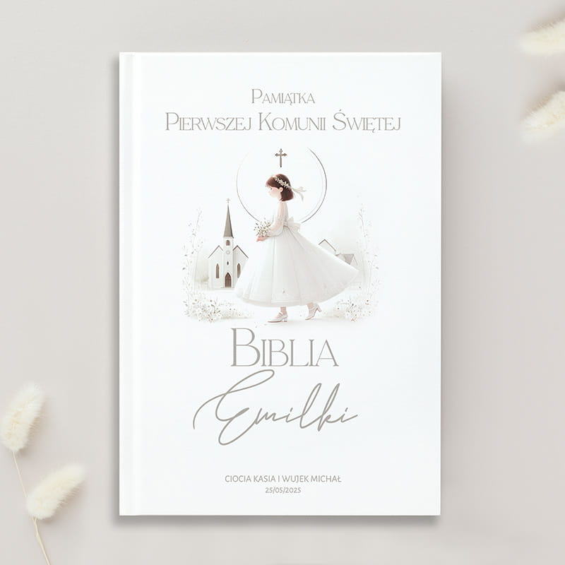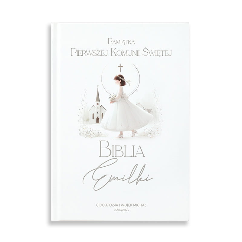 Biblia dla dziecka na Pierwszą Komunię Świętą zachwyca minimalistyczną, białą okładką o matowym wykończeniu. Centralnym punktem jest subtelna ilustracja dziewczynki w komunijnej sukience, która kroczy wśród kwiatów, trzymając w dłoniach bukiet. Jej postać otacza delikatny okrąg z krzyżem – symbol wiary i sakramentu. W tle widoczny jest biały kościół z wysoką wieżą, symbolizujący duchowość i wspólnotę. Cała kompozycja jest utrzymana w jasnych, pastelowych odcieniach, które nadają całości lekkości i spokoju. Na górze okładki znajduje się napis: „Pamiątka Pierwszej Komunii Świętej”, wykonany elegancką, klasyczną czcionką. Pod ilustracją, dużą ozdobną literą wypisano słowo „BIBLIA”, a poniżej – personalizowane imię dziecka, np. „Emilki”. To właśnie dzięki personalizacji biblia exclusive nabiera wyjątkowego, osobistego charakteru. Na dole okładki umieszczono dedykację: „Ciocia Kasia i Wujek Michał” oraz datę uroczystości: „25/06/2025”. Kaligraficzne litery i subtelne akcenty tworzą harmonijną całość, która idealnie pasuje do charakteru Pierwszej Komunii Świętej. Solidna, twarda oprawa zapewnia trwałość, a wysokiej jakości papier sprawia, że Biblia posłuży przez długie lata.