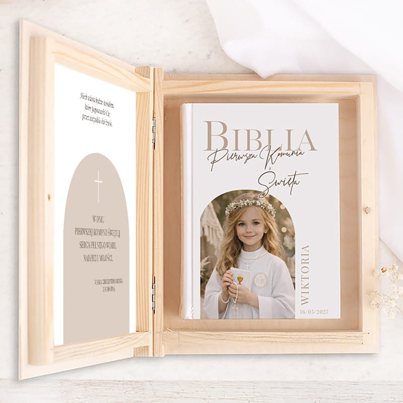 Biblia komunijna ze zdjęciem dziecka na okładce, umieszczona w drewnianym pudełku, to wyjątkowy i elegancki prezent na Pierwszą Komunię Świętą.
