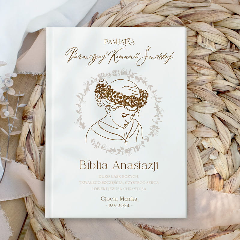Biblia personalizowana na Pierwszą Komunię Świętą wyróżnia się subtelną i elegancką oprawą. Twarda, kremowa okładka ma aksamitnie matowe wykończenie, które nadaje jej klasycznego charakteru. W centralnej części znajduje się rysunek dziewczynki ze spuszczoną głową, ujętej w chwili modlitwy. Wianek z delikatnych kwiatów otacza postać, tworząc harmonijną kompozycję. U góry okładki widnieje kaligraficzny napis: „Pamiątka Pierwszej Komunii Świętej”, a tuż pod ilustracją – spersonalizowany napis: „Biblia + imię dziecka”. Poniżej umieszczono wzruszające życzenia: