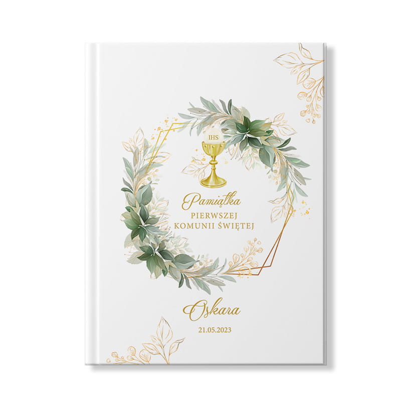 Elegancka biblia dla dziecka zachwyca subtelną, klasyczną szatą graficzną. Twarda, biała okładka ma delikatne, matowe wykończenie, które podkreśla jej szlachetny charakter. Centralnie umieszczony jest złocony kielich komunijny z symbolem IHS, który nawiązuje do sakramentu Eucharystii. Całość otacza bogato zdobiony wianek z zielonych liści i delikatnych kwiatów, przeplatany złotymi liniami w geometrycznym stylu. Na środku okładki widnieje napis „Pamiątka Pierwszej Komunii Świętej” w eleganckiej, złotej czcionce. Poniżej znajduje się personalizowany podpis z imieniem Biblia + imię dziecka, uzupełniony datą. Subtelne złote detale i ozdobne liściaste ornamenty w rogach nadają całości wyjątkowego charakteru. Wnętrze tej biblii personalizowanej na Pierwszą Komunię Świętą to zbiór najpiękniejszych opowieści ze Starego i Nowego Testamentu, napisanych językiem zrozumiałym dla najmłodszych. Znajdziesz tu barwne ilustracje, które ożywiają biblijne historie – od stworzenia świata po życie Jezusa. Solidne szycie i gruby papier gwarantują trwałość przez lata, nawet przy częstym czytaniu. Złocony grzbiet z tłoczeniem „Biblia – Święta Historia dla naszych dzieci” dodaje elegancji i podkreśla wyjątkowy charakter tej pamiątki.