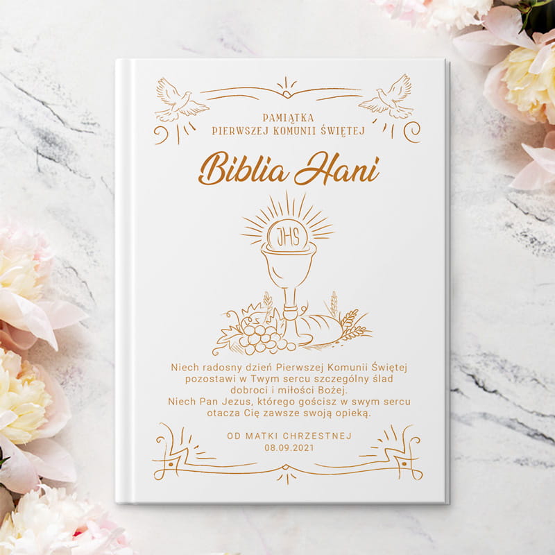 Biblia została oprawiona w twardą, białą okładkę, która nadaje jej elegancji i subtelności. Na jej powierzchni znajdują się złote grafiki o głębokim znaczeniu sakramentalnym – w centralnym miejscu kielich z hostią, symbolizujący Eucharystię, otoczony winogronami i chlebem, odnoszącymi się do biblijnych motywów Wieczerzy Pańskiej. Powyżej umieszczono personalizowany napis – Biblia [IMIĘ DZIECKA], który sprawia, że każda książka jest unikalna. Nad nim widnieje „Pamiątka Pierwszej Komunii Świętej”, a całość dopełniają dwie gołębice – znak Ducha Świętego i pokoju. Na dolnej części okładki znajduje się dedykacja, np. „Od Matki Chrzestnej”, oraz data przyjęcia sakramentu, dzięki czemu Biblia staje się spersonalizowaną pamiątką na długie lata. Wnętrze Biblii zostało zaprojektowane tak, by ułatwić dzieciom zgłębianie wiary. Kolorowe ilustracje pomagają w zrozumieniu biblijnych opowieści, a duża, czytelna czcionka sprawia, że tekst jest przejrzysty i łatwy do czytania. Przejrzysty układ stron umożliwia szybkie odnalezienie najważniejszych fragmentów. Papier wysokiej jakości, szyty grzbiet i solidne wykonanie zapewniają trwałość księgi, dzięki czemu może towarzyszyć dziecku przez całe życie.