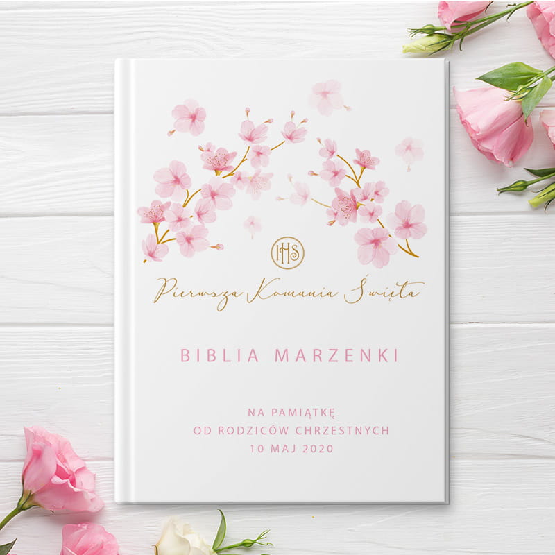 Biblia na Komunię Świętą z imieniem dziecka i motywem różowych magnolii to klasyczny, elegancki i trwały prezent. Biała oprawa, subtelne złocenia i możliwość personalizacji sprawiają, że każdy egzemplarz staje się niepowtarzalnym podarunkiem. Bogate ilustracje i przystępny język czynią ją inspirującą lekturą, do której dziecko będzie mogło wracać przez całe życie.