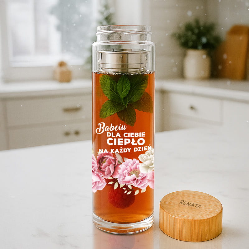 Prezent, który łączy uczucia z praktycznym zastosowaniem, ma wyjątkową wartość. Szklany bidon z zaparzaczem i imieniem to propozycja, która codziennie przypomina babci, jak bardzo jest ważna. Personalizowany napis „Babciu, dla Ciebie ciepło na każdy dzień” sprawia, że bidon staje się czymś więcej niż przedmiotem – jest wyrazem troski i bliskości. Co istotne, taki upominek można wykorzystać w domu, podczas spacerów albo w czasie spotkań rodzinnych.