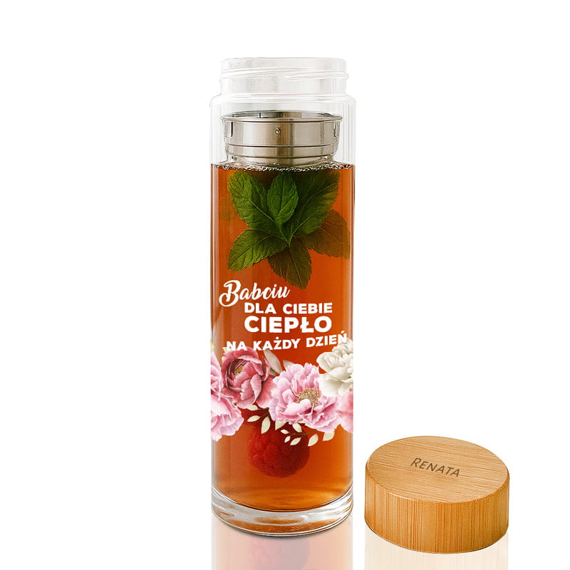 Szklany bidon z zaparzaczem i imieniem to elegancki, a przy tym codziennie użyteczny prezent dla babci. Ciepłe słowa, nadrukowane na froncie, nadają mu sentymentalny charakter, a bambusowa zakrętka z imieniem podkreśla osobisty wymiar upominku. Dzięki zaparzaczowi można łatwo przygotować herbatę ziołową lub owocowy napar. To przemyślany i estetyczny prezent z okazji Dnia Babci.