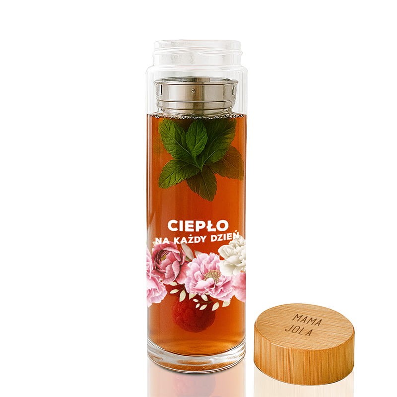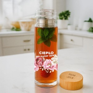 Bidon wykonany jest z wysokiej jakości przezroczystego szkła, które pięknie eksponuje zawartość – herbaty, napary czy wodę z dodatkami. Wewnątrz znajduje się wygodny zaparzacz, umożliwiający przygotowanie ulubionych napojów. Na froncie widnieje napis „CIEPŁO NA KAŻDY DZIEŃ” oraz delikatna grafika kwiatowa w odcieniach różu i bieli. Całość uzupełnia bambusowa zakrętka z personalizowanym podpisem – personalizacji podlega wyłącznie podpis na pokrywce.