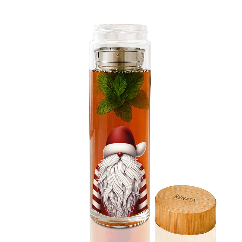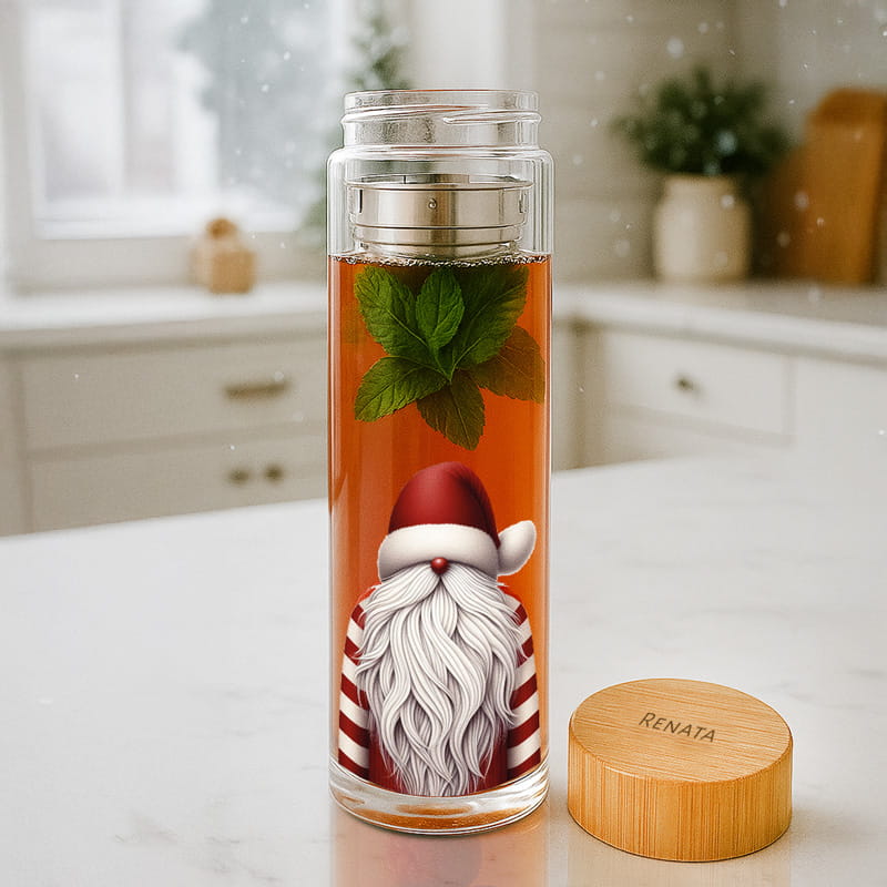Szklany bidon z zaparzaczem i grafiką świąteczną to praktyczny i estetyczny prezent na Boże Narodzenie. Ilustracja z Mikołajem oraz możliwość dodania imienia na bambusowej zakrętce sprawiają, że prezent nabiera osobistego charakteru. Idealny do herbaty lub zimowych naparów. To podarunek, który łączy ciepło, funkcjonalność i świąteczny nastrój