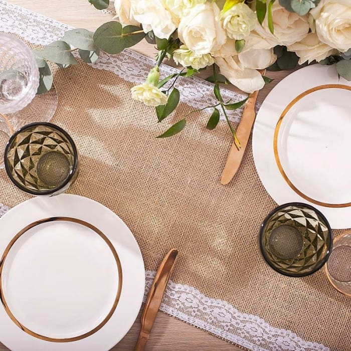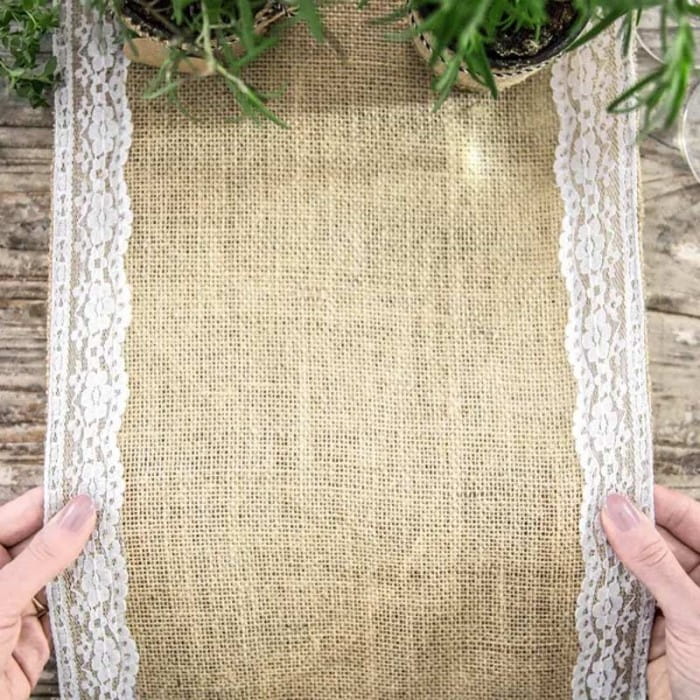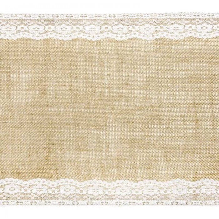 Bieżnik z juty z białą koronką to idealna dekoracja stołu na przyjęcie w stylu eko, natural lub boho