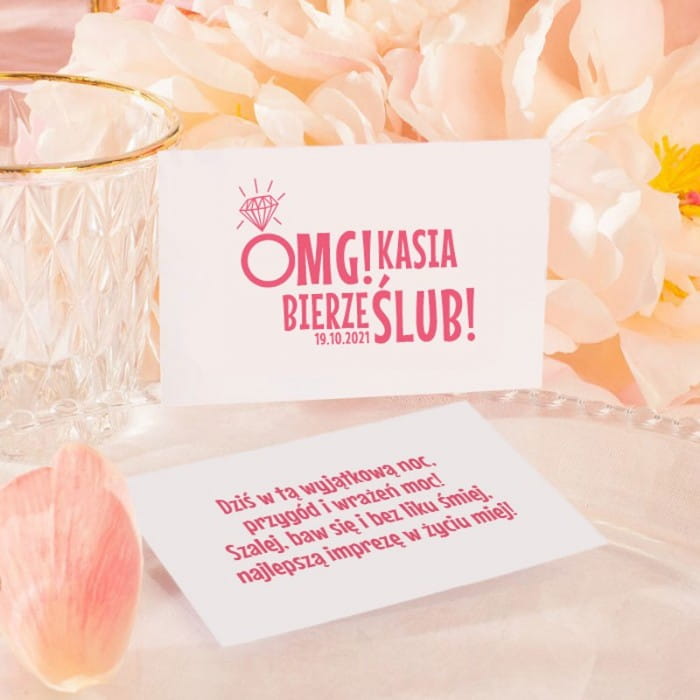 Personalizowane bileciki z podziękowaniem pozwolą wyrazić wdzięczność za obecność podczas Wieczoru Panieńskiego. Idealnie sprawdzą się jako dekoracja stołu, ponieważ udekorowane są piękną grafiką z kolekcji OMG! Dzięki personalizacji będzie to wyjątkowe podziękowanie.