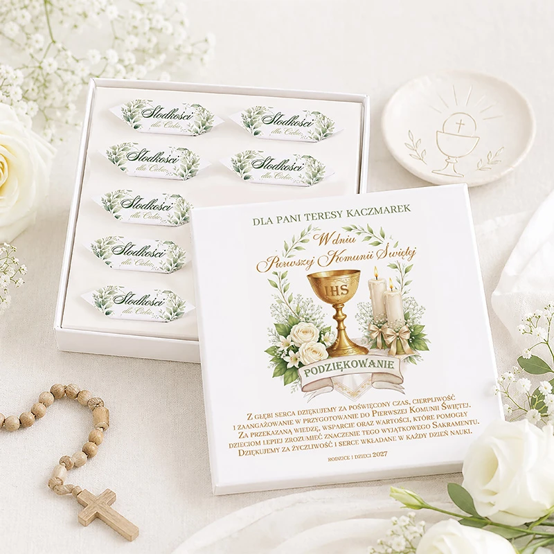 Bombonierka z krówkami jako podziękowanie komunijne dla katechetki to elegancki i symboliczny upominek, który pozwala wyrazić wdzięczność za zaangażowanie i wsparcie w przygotowaniu do sakramentu.