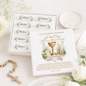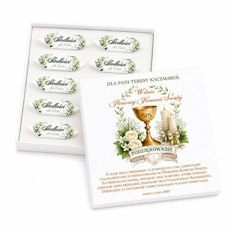 Bombonierka doskonale sprawdzi się jako podziękowanie dla katechety na Komunię zarówno od jednego dziecka, jak i od całej grupy. Bombonierka z krówkami jako podziękowanie komunijne dla katechety to elegancki i symboliczny prezent, który wyraża wdzięczność w wyjątkowy sposób. Świetnie sprawdzi sprawdzi się jako elegancki i symboliczny prezent od rodziców oraz dzieci komunijnych.
