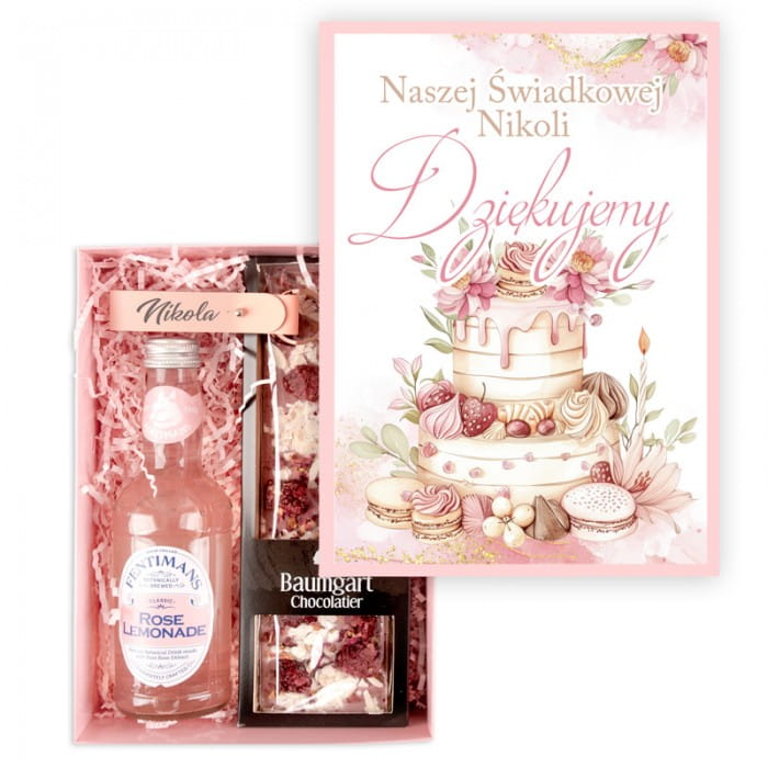 Nasz box na podziękowanie dla świadkowej to harmonijnie skomponowany zestaw pełen pięknych i praktycznych elementów. W eleganckim, różowym pudełku znajdziesz orzeźwiającą lemoniadę różaną, której delikatny smak doskonale wkomponuje się w atmosferę wdzięczności i celebracji. Lemoniada jest wzbogacona o personalizowany brelokiem z imieniem. Obok lemoniady znajduje się wykwintna tabliczka czekolady Baumgart Chocolatier, bogata w smaku i ozdobiona liofilizowanymi malinami i kokosem, które nadają jej niepowtarzalnego aromatu i wyglądu. Całość zestawu zapakowana jest w różowe pudełko, na którym znajduje się delikatna, kwiatowa grafika z napisem: