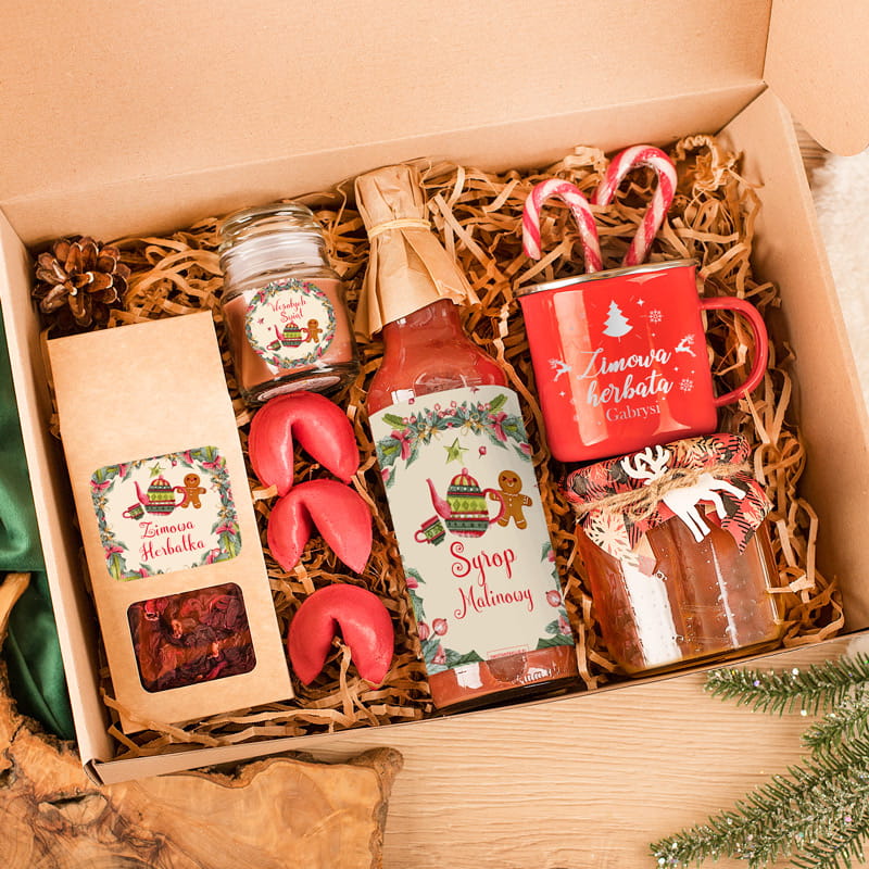 Zestaw zawiera czerwony, personalizowany kubek z nadrukiem "Zimowa herbata [imię]" oraz porcję herbaty. W pudełku znajduje się również duża butelka malinowego syropu, idealnego do herbaty lub deserów. Dopełnieniem są: świeczka zapachowa w szkle z naklejką „Wesołych Świąt”, naturalny miód w słoiku oraz świąteczne cukierki i ciasteczka z wróżbą. Wszystko estetycznie ułożone w wiórkowym wypełnieniu, tworzy spójny, ciepły zestaw.