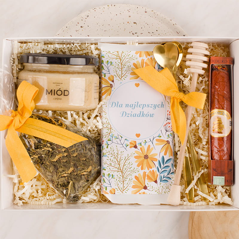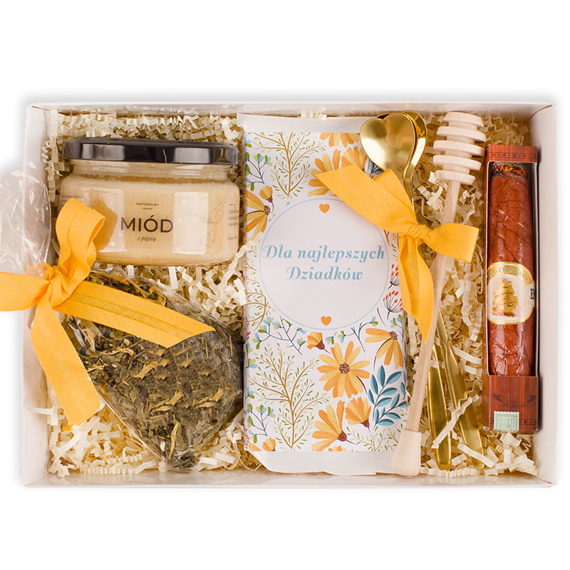 W zestawie dla dziadków znajdują się starannie dobrane produkty, które tworzą spójną, smakowitą kompozycję. Naturalny miód oraz aromatyczna herbata zachęcają do chwili relaksu przy kubku ciepłego naparu. Słodkie dodatki w postaci czekolad z pewnością przypadną do gustu dziadkom. W zestawie nie zabrakło również estetycznych akcesoriów - takich jak eleganckie łyżeczki czy nabierak do miodu – które podnoszą wartość upominku i czynią go jeszcze bardziej praktycznym. Wszystko zapakowane jest w ozdobne pudełko z dekoracyjną wyściółką, dzięki czemu prezent wygląda pięknie już od pierwszej chwili.