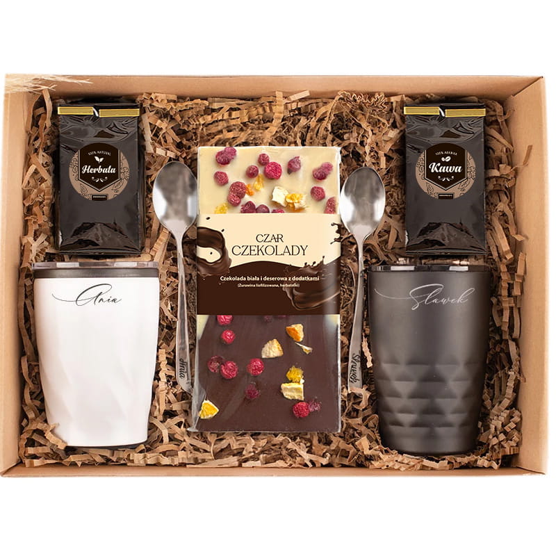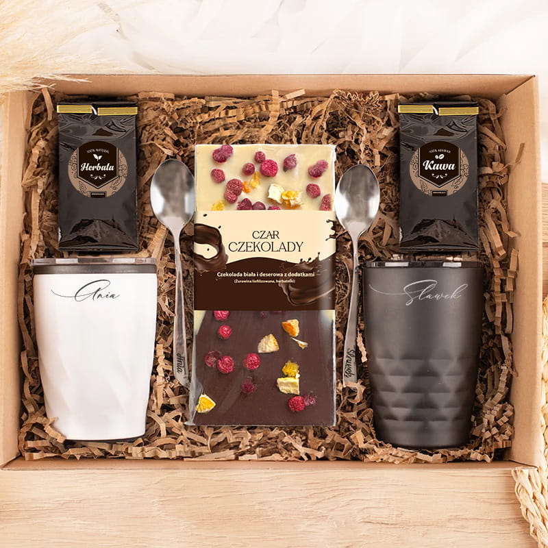 - W skład zestawu wchodzą kubki termiczne. Jeden jest biały, a drugi czarny. Na nich zostaną wygrawerowane imiona pary. To nie tylko praktyczny element, ale także pamiątka na lata. Łyżeczki z wygrawerowanymi imionami nadają osobisty charakter i indywidualność zestawowi. W zestawie znalazła się także pyszna herbatka oraz kawa. Oryginalna czekolada dodaje słodkiego akcentu i doskonałego smaku. Wszystko spakowane jest w stylowe, kraftowe pudełko.