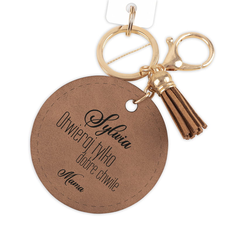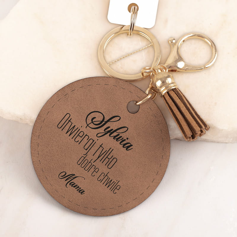 Brelok wykonano z wysokiej jakości skóry w klasycznym odcieniu brązu. Okrągły kształt cechuje się prostotą i starannym wykończeniem. Na froncie znajduje się motywacyjny cytat z personalizacją, grawerowany w eleganckim kroju pisma. Złote zapięcie i kółko umożliwiają wygodne przypięcie do kluczy, a ozdobny chwost w kolorze skóry dodaje całości stylowego charakteru. Na breloku widnieje napis „[imię] otwieraj tylko dobre chwile [podpis]”