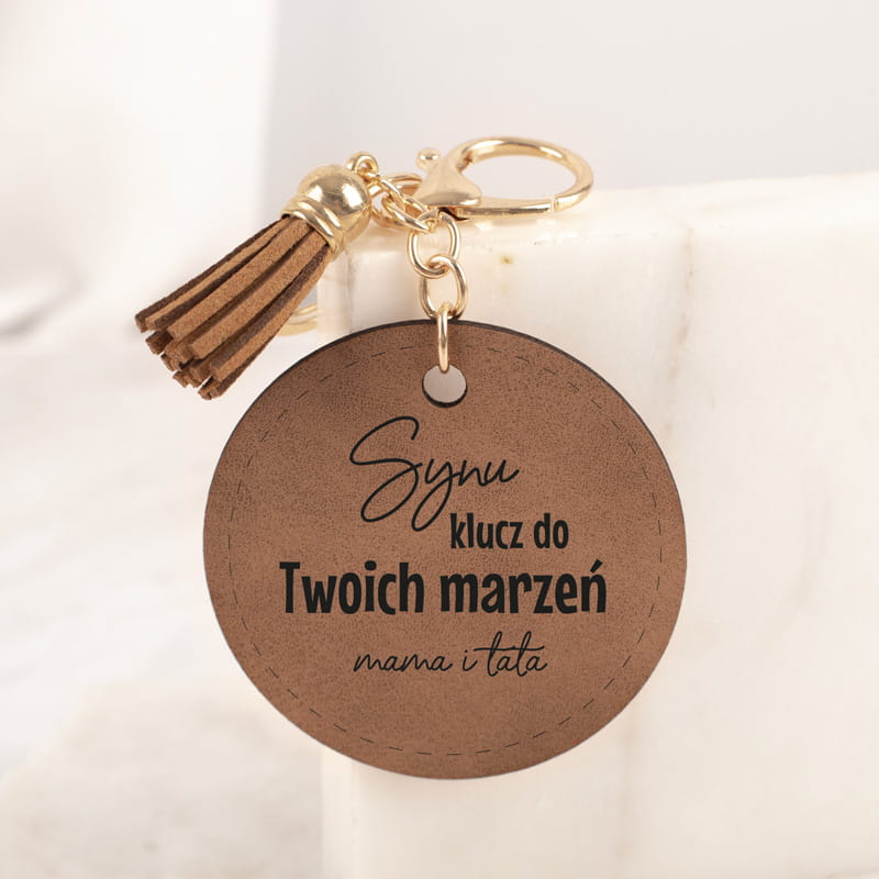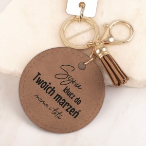 Brelok wykonano z matowej skóry w ciepłym odcieniu brązu. Ma okrągły kształt i starannie wykończone krawędzie. Na jego powierzchni znajduje się czytelny grawer z motywującym tekstem „Synu, klucz do twoich marzeń [podpis]”, który w tym wariancie skierowany jest do syna. Złote zapięcie i kółko umożliwiają szybkie przypięcie, a ozdobny frędzel ze skóry dodaje elegancji. Całość prezentuje się nowocześnie, ale z nutą klasycznego stylu.