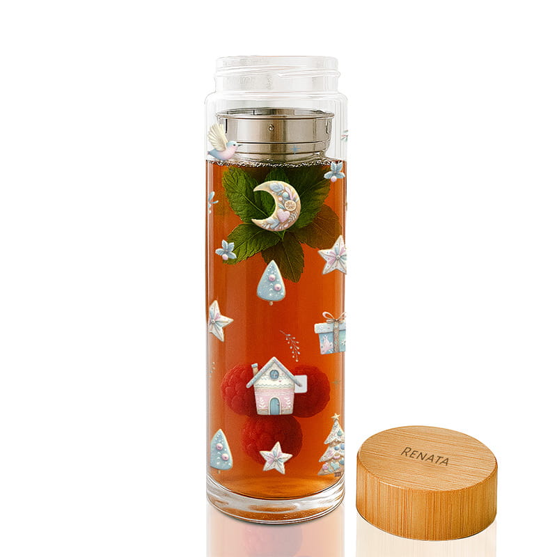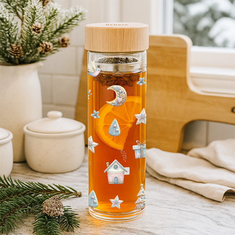 Funkcjonalna i stylowa butelka szklana z zaparzaczem to trafiony pomysł na świąteczny prezent dla bliskiej osoby. Wykonana z trwałego szkła, z bambusową zakrętką i metalowym zaparzaczem, sprawdzi się do herbaty, naparów i wody z owocami. Świąteczne grafiki nadają jej wyjątkowego charakteru, czyniąc z niej praktyczny i estetyczny prezent na Mikołajki lub pod choinkę.