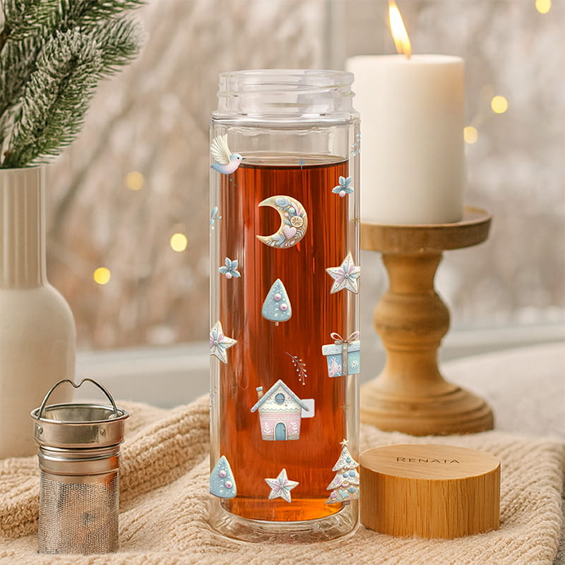 Produkt to wysokiej jakości szklana butelka z zaparzaczem, przeznaczona do zaparzania herbat, ziół, a także przygotowywania owocowych naparów. Korpus butelki wykonano z odpornego na temperatury szkła borokrzemowego, które jest trwałe i bezpieczne. Na powierzchni znajdują się subtelne grafiki w świątecznym stylu - gwiazdki, choinki, księżyc, domki i inne zimowe detale, które dodają jej wyjątkowego uroku. Zakrętka wykonana jest z naturalnego bambusa, co wzmacnia ekologiczny wydźwięk produktu. Możliwość personalizacji imieniem nadaje mu indywidualnego charakteru. Szklany bidon ma kompaktową pojemność, idealną do codziennego użytku w domu, pracy lub podróży.