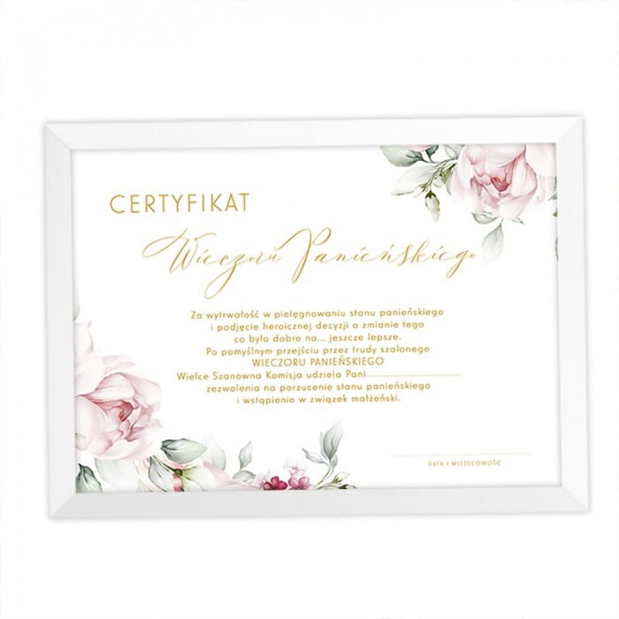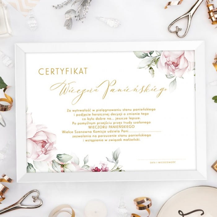 - Taki certyfikat w ramce to wyjątkowy sposób na uczczenie i upamiętnienie wieczoru panieńskiego. Stanowi on nie tylko symboliczną pamiątkę z tego wyjątkowego momentu, ale także jest humorystycznym akcentem, idealnie udającym powagę ze względu na „urzędowy” charakter dokumentu. Elegancka ramka sprawia, że taki certyfikat zostanie zachowany na długo, a być może nawet zawiśnie na ścianie. Dokument może być prezentem od przyjaciółek dla przyszłej panny młodej. To trwała i nietuzinkowa pamiątka, która przypomni o tych wyjątkowych chwilach.