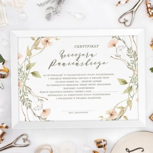 Certyfikat z wieczoru panieńskiego do wypisania to ciekawy pomysł na zwieńczenie imprezy. Plakat umieszczony w ozdobnej ramce zawiera zabawne treści, które należy uzupełnić imieniem i nazwiskiem przyszłej panny młodej. Choć całość ma humorystyczny charakter, to design jest bardzo kobiecy i nawiązuje do stylu boho. Idealna pamiątka na lata!