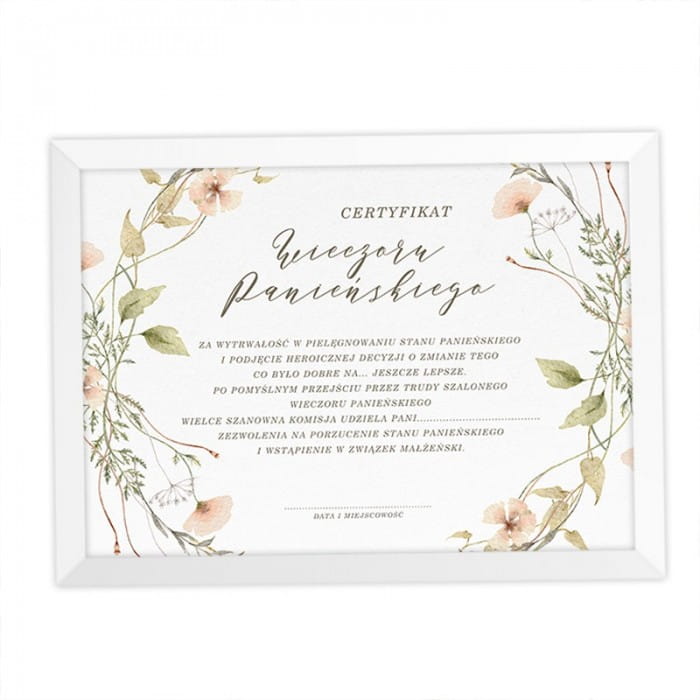 Certyfikat został ozdobiony subtelną grafiką z motywem polnych kwiatów. Dzięki temu znakomicie sprawdzi się jako upominek dla osoby o romantycznej duszy. Treść jest zabawna i potwierdza uczestnictwo w wieczorze panieńskim. Gotowy tekst należy uzupełnić o imię i nazwisko przyszłej panny młodej, a także datę imprezy i miejscowość. Plakat jest wydrukowany na wysokogatunkowym papierze i umieszczony w prostej, minimalistycznej ramce w kolorze białym.