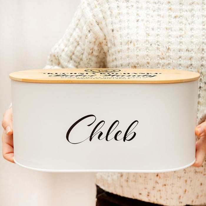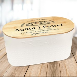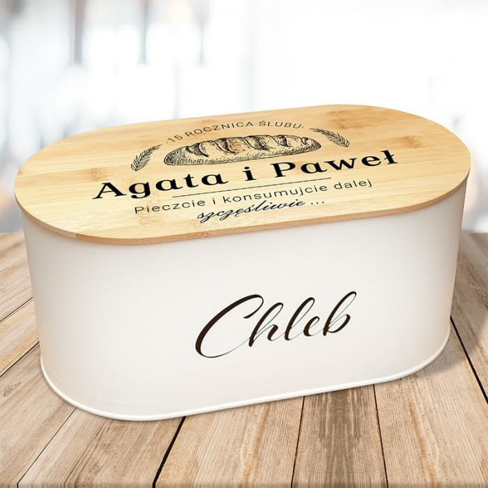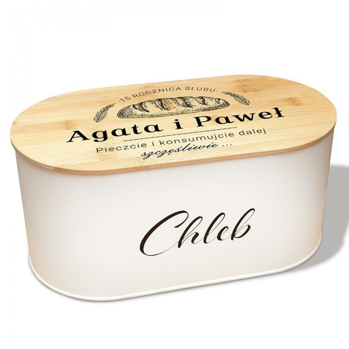 - Szukacie ładnego, a jednocześnie takiego prezentu dla małżeństwa, który nie wyląduje na dnie szafy? Doskonale sprawdzi się chlebak – praktyczny prezent na rocznicę ślubu. Jest bardzo precyzyjnie wykonany. Dno zrobione jest z metalu, natomiast wieko z drewna. Na pokrywie nadrukujemy Grafikę chleba i dwóch kłosów, położonych symetrycznie po dwóch stronach. Nad chlebem będzie widniała personalizacja, czyli liczba lub cyfra z dopiskiem „rocznica ślubu”. Poniżej znajdą się imiona małżonków obchodzących jubileusz małżeństwa. W dolnej części wieka nie zabraknie życzeń: „Pieczcie i konsumujcie razem szczęśliwie...” Jest to oczywiście metafora wspólnego życia. Ponadto stanowi świetne nawiązanie do praktycznego zastosowania chlebaka. Na bocznej ściance metalowej części, utrzymanej w białym kolorze, znajduje się jeszcze napis: „chleb”. Warto podkreślić, że chlebak jest na tyle duży, że zmieści się w nim spory bochenek chleba. Dobrze wpisze się w rustykalny, ale i nowoczesny charakter kuchni.