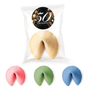 Ciasteczka pakowane są pojedynczo w przezroczyste woreczki z naklejką utrzymaną w czarno-złotej stylistyce z napisem „50 urodziny”. W zestawie znajduje się 10 sztuk w kolorze do wyboru: klasyczny beżowy, różowy, zielony, niebieski lub czekoladowy. Każde ciasteczko zachowuje charakterystyczny, półokrągły kształt i chrupiącą strukturę. Wnętrze skrywa zwiniętą wróżbę na papierku.