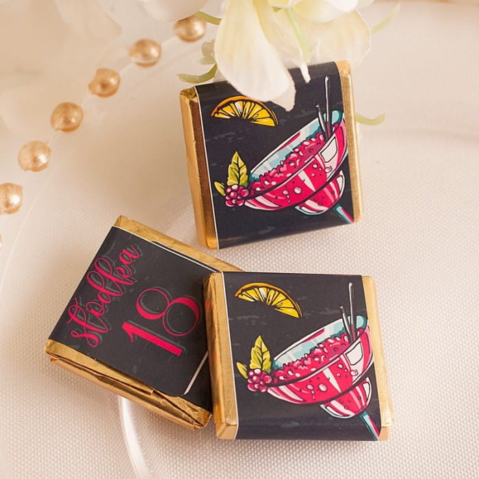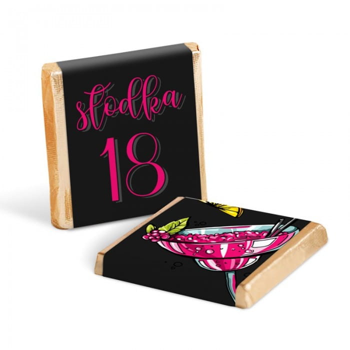 Zestaw 10 sztuk czekoladek udekorowanych etykietą w ciemnej kolorystyce z grafiką przedstawiającą drinki i napisem słodka 18. Każda czekoladka jest starannie wykonana. Jest to pyszna przekąska, która sprawi, że Twoi goście poczują się wyjątkowo docenieni. Czekoladki na 18 urodziny to doskonały sposób na wyrażenie wdzięczności i podkreślenie roli gości w tym ważnym dniu. Niech ta słodka niespodzianka dodatkowo umili atmosferę Twojego przyjęcia.