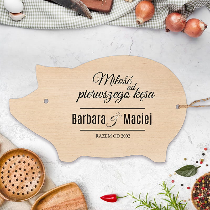Oryginalna drewniana deska w kształcie świnki z personalizowanym napisem to zabawny i symboliczny prezent dla pary z okazji rocznicy. Napis „Miłość od pierwszego kęsa” w połączeniu z imionami i datą tworzy wyjątkową pamiątkę. Sprawdzi się jako dekoracja do kuchni, ale także jako praktyczny drobiazg do wspólnego gotowania.