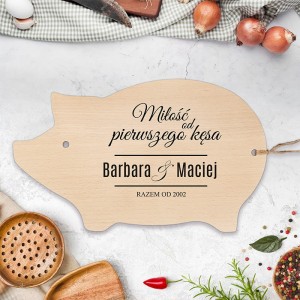 Deska została wykonana z naturalnego drewna bukowego i ma formę stylizowanej sylwetki świnki. Jej lekka, gładka powierzchnia sprzyja codziennemu użytkowaniu, a zarazem pełni funkcję ozdobną. Napis jest precyzyjny i estetyczny – zawiera wyrażenie „Miłość od pierwszego kęsa”, imiona pary oraz datę rozpoczęcia wspólnej drogi. Zastosowana czcionka nadaje projektowi elegancki wygląd, który doskonale komponuje się z naturalnym odcieniem drewna.