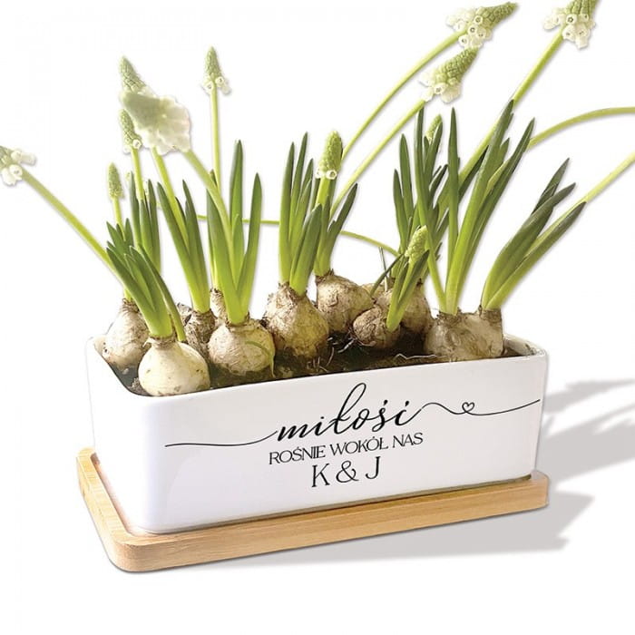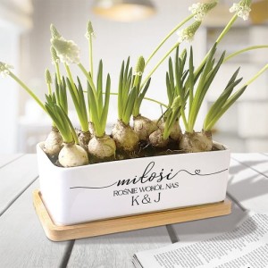 Napis "Miłość rośnie wokół nas" wraz z inicjałami pary dodaje osobistego akcentu, sprawiając, że doniczka staje się symbolem ich związku. Bambusowa podstawka nie tylko estetycznie współgra z ceramiką, ale także chroni powierzchnię, na której stoi doniczka, dodając praktyczności prezentowi.