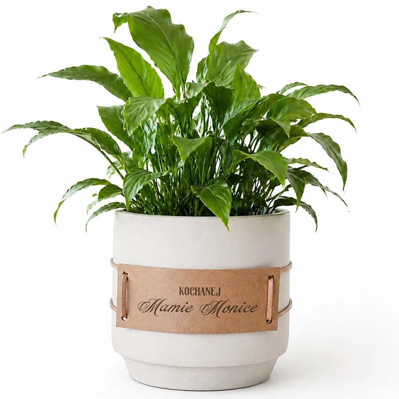Ceramiczna doniczka jest w eleganckim, szarym kolorze. Osłonkę zdobi skórzana opaska z wygrawerowanym napisem "Kochanej Mamie" oraz imieniem mamy. Skórzany pasek z napisem dopełniają dołączone rzemyki, które w łatwy sposób wiąże się na doniczce. To świetna osłonka na różnego rodzaju rośliny i kwiaty domowe. Stanowi ciekawą dekorację salonu, kuchni lub sypialni. Świetnie komponuje się z zielonymi roślinami, które wprowadzają do wnętrza świeżość i harmonię.