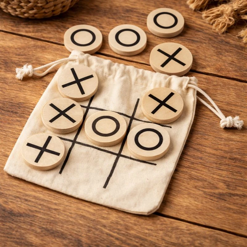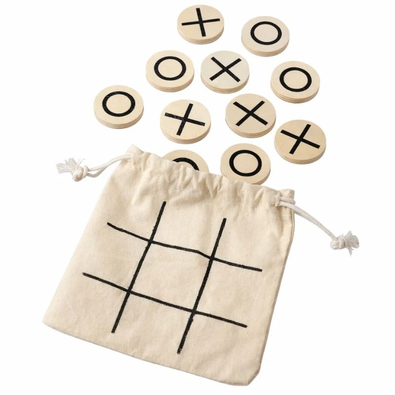 Drewniana gra kółko i krzyżyk to zestaw składający się z 10 żetonów oznaczonych symbolami „X” i „O” oraz praktycznego, bawełnianego woreczka pełniącego funkcję planszy i etui. Woreczek ze sznurkiem pozwala na przechowywanie elementów i wygodne zabranie gry w dowolne miejsce.